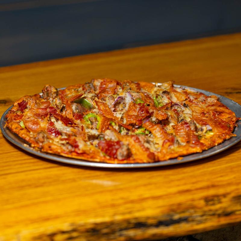 10” Cauliflour $16.49 | 12” Med $15.99 | 16” Large $25.99 • Sausage, pepperoni, bacon, onion, green pepper